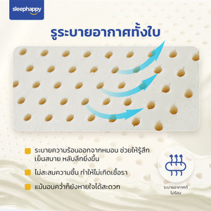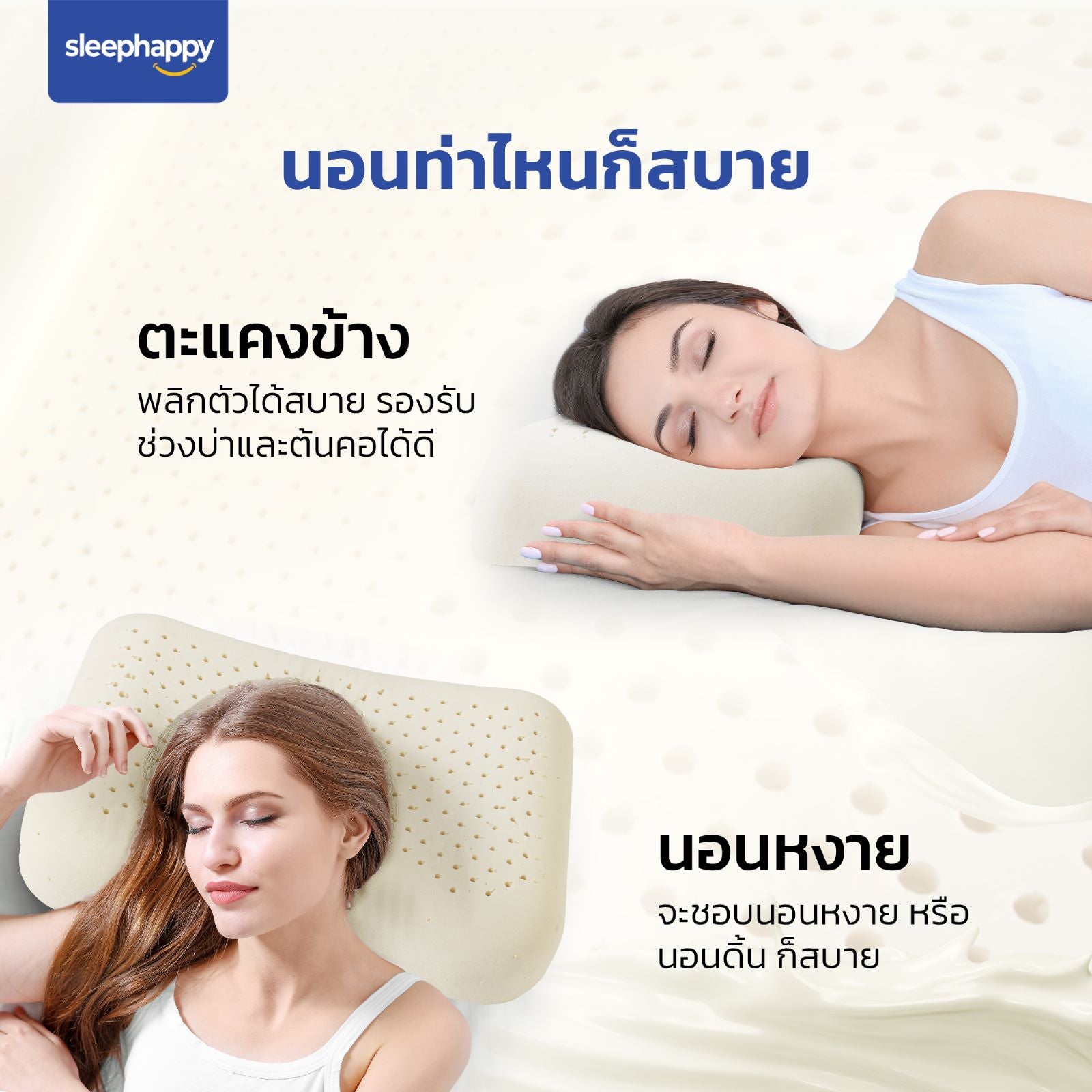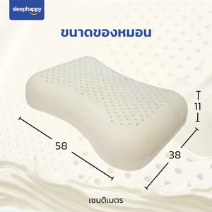SleepHappy Latex Pillow is a 100% natural latex pillow with a flexible heart shape. It is designed to be ergonomically designed to curve around the shoulders. It supports the head, neck, shoulders, and back, making it easier to change sleeping positions throughout the night. It also has ventilation holes throughout the pillow to help circulate air, preventing heat and moisture buildup, helping to promote deeper sleep.