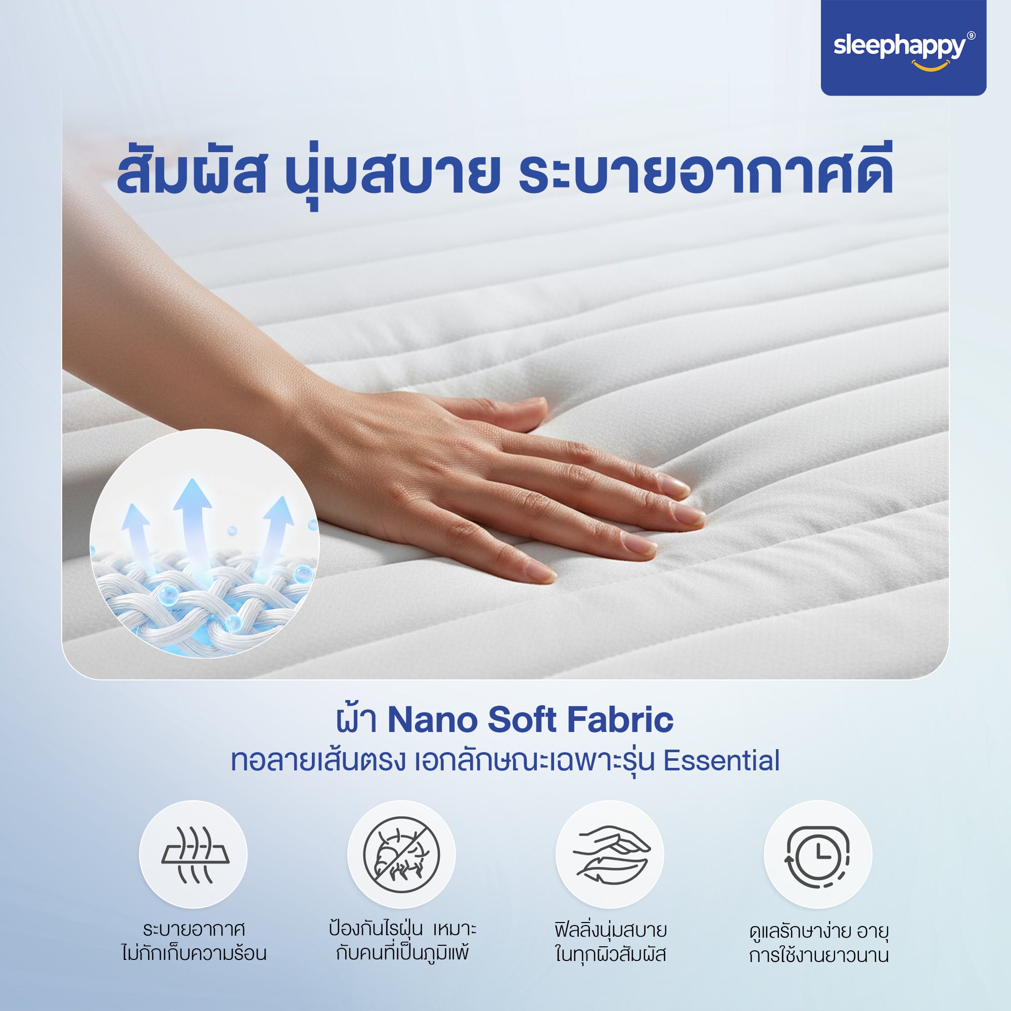ผ้าหุ้มนาโนซอฟท์ทอลายเส้นตรงเอกลักษณ์เฉพาะรุ่น ให้ผิวสัมผัสเรียบลื่น นุ่มสบาย ระบายอากาศได้ดีเยี่ยม ลดการสะสมความร้อนและความอับชื้น นอนแล้วไม่อับชื้น เหมาะสำหรับผู้ที่ผิวแพ้ง่ายและเป็นภูมิแพ้