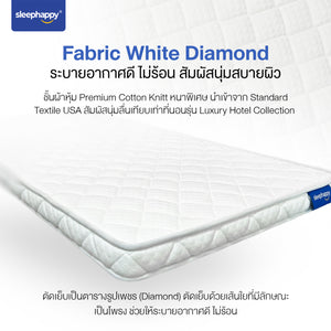 ผ้าหุ้มสีขาว เป็นผ้าคอตต้อน นิตตย์ พรีเมี่ยม “Fabric White Diamond“ ตัดเย็บเป็นตารางแบบรังผึ้ง เพิ่มการระบายอากาศ ให้สัมผัสหนานุ่ม ไม่ร้อน มีความยืดหยุ่นสูง คงทน ยืดอายุการใช้งาน