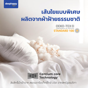 ชุดผ้าปูที่นอน Supreme Luxury Bedding Set ผลิตจากผ้าฝ้ายและเส้นใยเทคโนโลยี Centium Core Technology® ด้วยเทคนิคการทอแบบพิเศษ เส้นใยฝ้ายล้อมรอบเส้นใยสังเคราะห์-ไมโคร ฟิลาเม้นท์ ที่เพิ่มความทนทานต่อแรงดึง ทำให้ใช้งานได้ยาวนานขึ้นมากถึง 30% เมื่อเทียบกับสินค้าทั่วไป ซักแล้ว แห้งเร็ว ประหยัดไฟ ไม่เป็นขุย เทคโนโลยีนี้ SleepHappy มีโรงงานที่เป็นผู้ถือลิขสิทธิ์เจ้าเดียวในประเทศไทย จาก สแตนดาร์ดเท็กซ์ไทล์ USA จากสหรัฐอเมริกา ผู้เชี่ยวชาญในอุตสาหกรรมสิ่งทออันดับ 1 ของโลก มายาวนานกว่า 82 ปี และชุดผ้าปูที่นอนคุณภาพเดียวกันกับโรงแรม 5 ดาว มาพร้อมกับสัมผัสที่นุ่มลื่น นุ่มนวล สบายผิว ความหรูหราที่เหนือชั้น ยกระดับการนอน เพื่อให้ชีวิตสุขยิ่งขึ้น