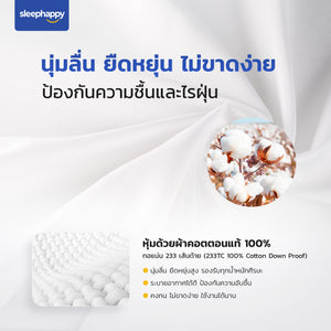 ▪ ผ้าหุ้มด้านนอกถักทอ 233 เส้นด้าย เป็นผ้าคอตต้อน ดาวน์ พรู้ฟ (233TC Cotton Down Proof) นำเข้าโดยตรงจาก Standard Textile USA ถักทอภายใต้มาตรฐานระดับโลก ซึ่งเป็นมาตรฐานระดับเวิลด์คลาสที่โรงแรม 5 ดาวทั่วโลกยอมรับ มีความนุ่มลื่น ยืดหยุ่น ไม่ขาดง่าย ระบายอากาศได้ดี ป้องกันความอับชื้น ไม่กักเก็บฝุ่น ป้องกันใยฟุ้งกระจายและไม่ให้ขนเป็ดสร้างความระคายเคืองนอกหมอน จึงไม่ก่อให้เกิดอาการแพ้ ไอหรือจาม